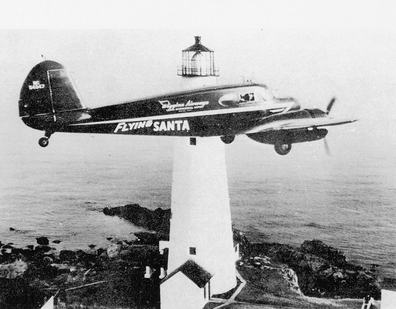 Edward Rowe Snowe, the Flying Santa for over 40 years, is shown here flying overBoston Harbor Light in Massachusetts. Back to the edition of: December 2001