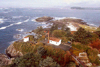 View from atop Lennard Island Light. Helipad is in the upper right. Buildings below are part of cable and winch system for retrieving/dispatching mail and other items to/from boat when conditions prevent landing. The station’s lawn tractor was sent out for warranty repairs via the cable and winch system. Smooth open water in background is approach toward Tofino (to the right, out of picture). Back to the edition of: February 2002