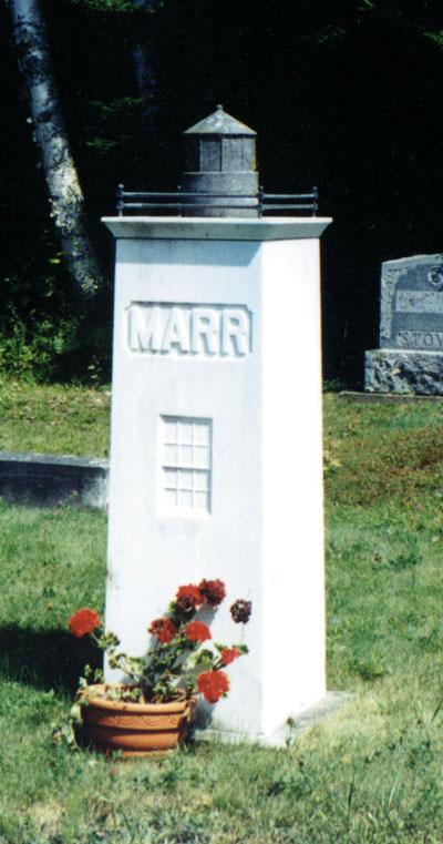 Wolcott Marr’s gravestone in a Southport, Maine cemeytary takes the form of the Hendricks Head Lighthouse where he served for so many years. Back to the edition of: May 2002