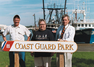 (l-r) Bill Collette, vice president of the American Lighthouse Foundation, Rita Anderson of the Newfoundland Lighthouse Society, Canada, and Art Motta, Director of Tourism and Marketing for the City of New Bedford pose in front of the newly erected sign naming the park by the Lightship Sailors Memorial, Coast Guard Park.