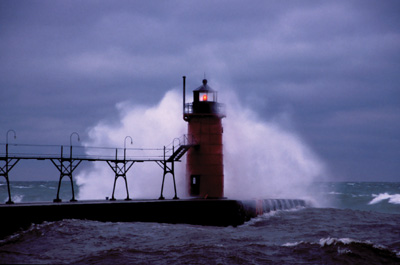 View of the South Haven south pier light from the north pier during a late November, 2001 gale. The billowing clouds of spray whip across the catwalk and on this day were pelting me with sleet by the time the wind had blown the cloud across the channel to the north pier where this photo was shot. Back to the edition of: August 2003