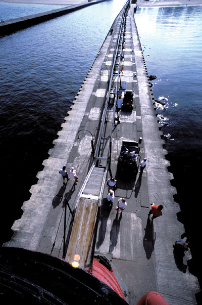 View from the balcony, looking down on the catwalk and the early visitors wanting to be among the first to tour the lighthouse that Saturday. Back to the edition of: August 2003
