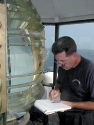 CWO Joe Cocking inspects the fourth order Fresnel lens at the Cape Neddick “Nubble” Lighthouse in York, Maine. Back to the edition of: November 2003