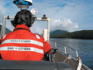Assistant keeper Gerry LaRose drives the station’s boat in the Tolmie Channel. Back to the edition of: November 2003