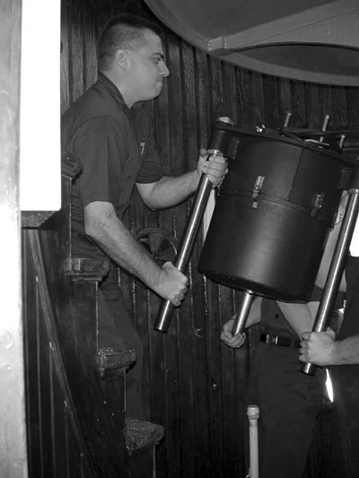 Auxiliarist Bob Trapani helps lift the motor for the DCB-224 optic up inside the Cape May Lighthouse lantern room. Back to the edition of: June 2004