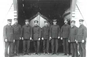 The Willapa Bay Life Saving Station Crew from a 1910 photograph. L-R Capt. Brown, Martin Jacobsen, Otto Hansen, John Hansen, James Smith, Nels Hansen, Ed Gunderson, Adolf Holst, and Anton Anderson. Back to the edition of: January 1999
