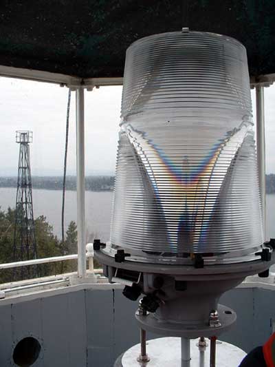 The new optic installed in Bluff Point Lighthouse. The old skeleton tower can be seen in the background to the left. Back to the edition of: Jan/Feb 2005