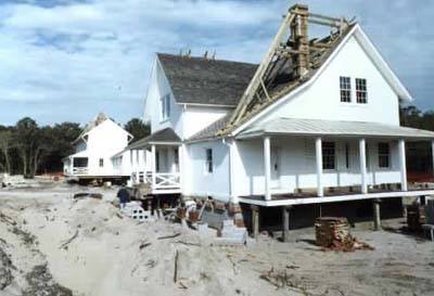 Movers have begun to fill in the new foundation of the Principal Keepers Quarters of Cape Hatteras Lighthouse. The Double Keepers Quarters is over the footers position of its new foundation. The steel beams were later pulled and the Double Keepers Quarters was lowered to its new location..