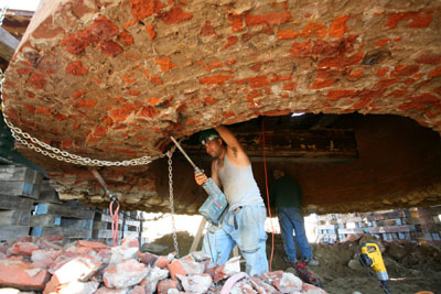 This amazing photograph was taken about 10 days before the move as the tower is lifted up by Expert House Movers. Would you be as brave as these workmen to stand underneath the 500-ton tower as it is suspended in the air? Photograph by Rob Benchley, courtesy of the Sconset Trust. Back to the edition of: November 2007