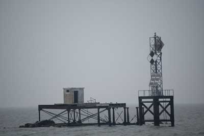 A concrete slab and blockhouse sits atop the original iron pilings from the Tangier Lighthouse, demolished in 1961. Next to it is a steel tower, which holds the new light. The site is not visible from Tangier Island. Back to the edition of: September 2008
