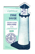 Lighthouse Dime Saver Do you remember the days when banks would give out coin booklets to encourage children as well as adults to save money? The booklets came in many different coin size denominations. When the coin slots were all full, you’d take it to the bank to be deposited into your passbook savings account, and the bank would give you a new booklet to start the process all over again. This one was called the Lighthouse Dime Saver from the East River Savings Bank which was probably in New York City. We wonder if any banks still hand these out.