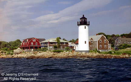 Continue toward the water, following as the road turns to the right, all the way to the lighthouse, a short distance before the end of the road. When leaving, follow the one-way signs to a stop sign and turn right to return to Leonard Street. The keeper’s house serves as a residence for a Coast Guard family. Please do not disturb the occupants. There are limited, short term (15 minutes) visitors’ parking spaces at the station. The station can also be viewed from Wingaersheek Beach in Gloucester. There is a substantial parking fee at the beach in the summer for non-residents of Gloucester. The Thacher Island Association of Rockport, Massachusetts, offers occasional lighthouse cruises; see www.thacherisland.org. Mapquest URL: Click here to get a map to this lighthouse! Listed on the