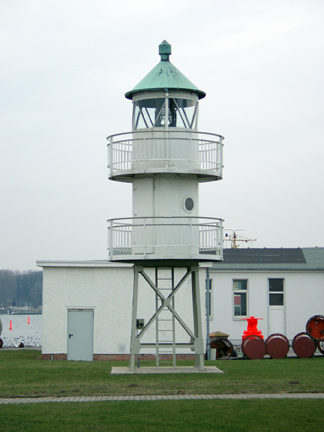 After this light was discontinued in 2000, the 50 foot tower was dismantled and moved to the grounds of the Water and Shipping Authority in Wismar, Haffeld. Only a small portion of the lower skeletal portion of the original tower was retained when it was reassembled in its new location.