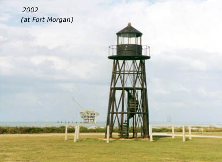 Notes: The 1873 tower was replaced by skeletal tower in 1966 and dismantled in 1979. It was later reassembled near the entrance to Fort Morgan's visitor parking lot. Phone for Fort Morgan: (334) 540-7125. As of December 2004, the lighthouse is in storage awaiting restoration. Tower Height: 30 Description of Tower: Black steel skeletal tower. Listed on the Lighthouse Digest Doomsday List of endangered lighthouses.