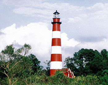 Other Buildings? 1910 two-story concrete keeper's dwelling, 1891 oil house. Date Established: 1833 Date Present Tower Built: 1867 Date Automated: 1965 Optics: 1867: First order Fresnel lens, now DCB 236 (lighted 2/1/1961). Current Use: Active aid to navigation. Open To Public? Yes. Museum? The Assateague Ligthouse is open every Friday through Sunday from 9 a.m. to 3 p.m., Easter weekend through Thanksgiving weekend. The first-order Fresnel lens from Assateague Lighthouse is on display at the Oyster and Maritime Museum in Chincoteague. The museum is open June through August, daily 10 a.m. to 5 p.m., spring and fall weekends 10 a.m. to 5 p.m. For more information call (757) 336-6117. Directions: Just north of Oak Hall take VA Route 175 east across the causeway and drawbridge to Chincoteague. Turn left on Main Street and then right at Maddox Boulevard. Continue straight ahead through a traffic rotary. Continue on the main road around a toll booth until you reach a parking area with a lighthouse sign. There is a 0.25-mile path up a knoll and through the woods to the lighthouse. Use insect repellent! Ava Boczko-Pan writes in October 2002: "A fee was charged to enter the park but it is good for an entire week - so return trips are not only possible but recommended." Keepers: David Watson, Tom Moore, Frank Jones, Samuel Quillen, Edgar Hopkins, John Anderton, Walter Wescott, William Collins.