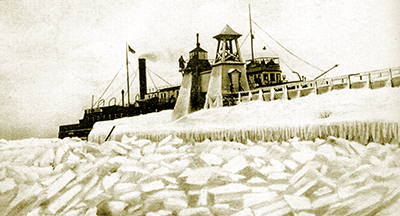 Notes: This lighthouse was moved when the pier was extended in 1896. It became a front range light, with a post light 600 feet away serving as the rear range. In 1912, the lighting equipment from the post light was relocated to a 66-foot wooden post 200 yards behind a new lighthouse on the North Pier, and the South Pier (range front) Light was destroyed. An automated light on a 35-foot skeletal tower was installed at the end of the South Pier. The pier was later shortened in the 1930s. Height of Focal Plane: 25 Description of Tower: Wooden, square pyramidal tower.